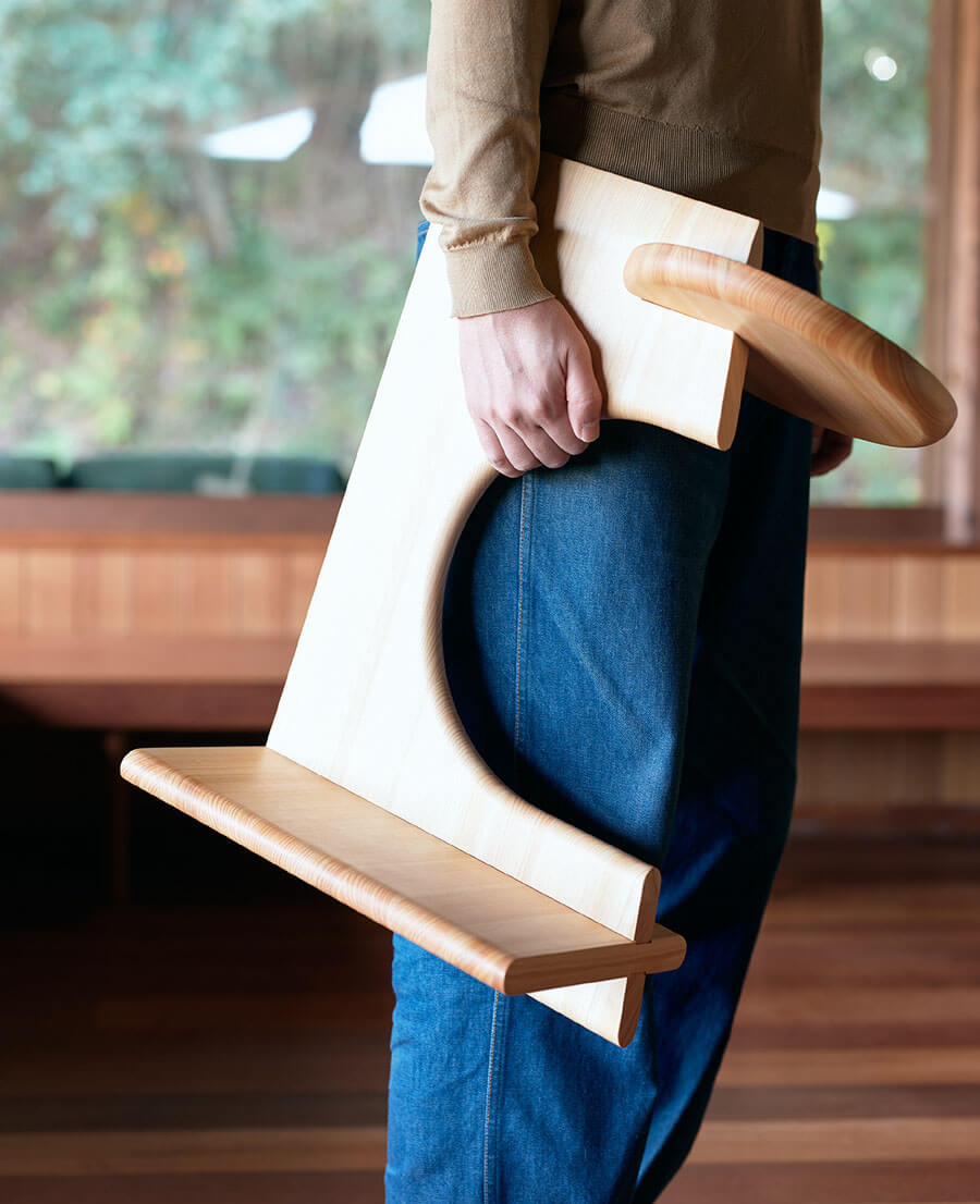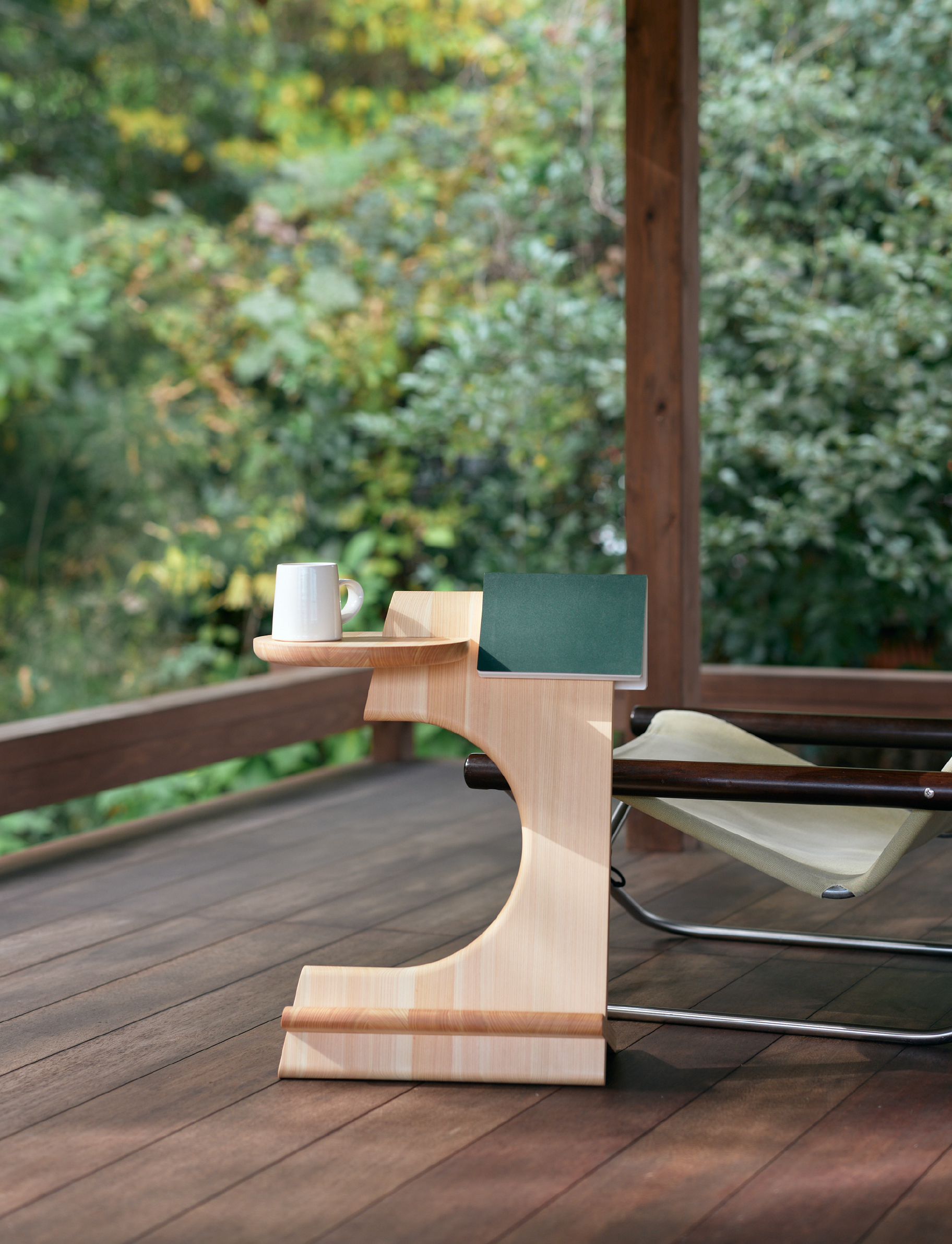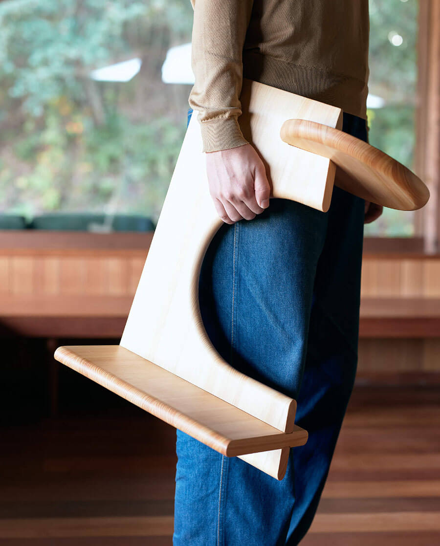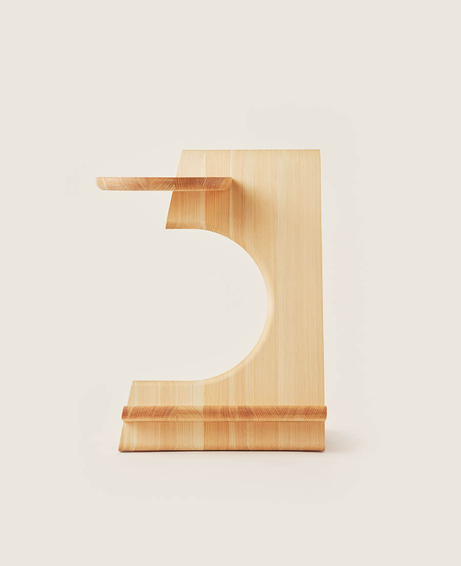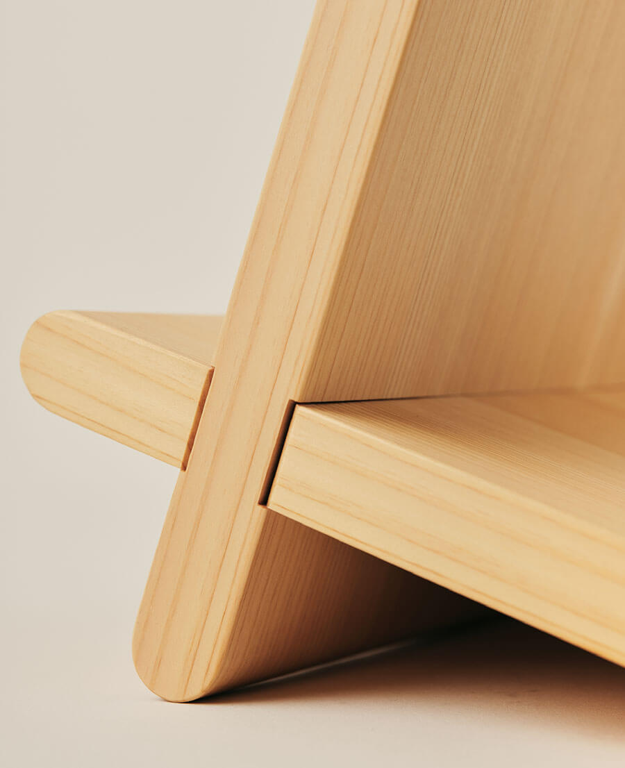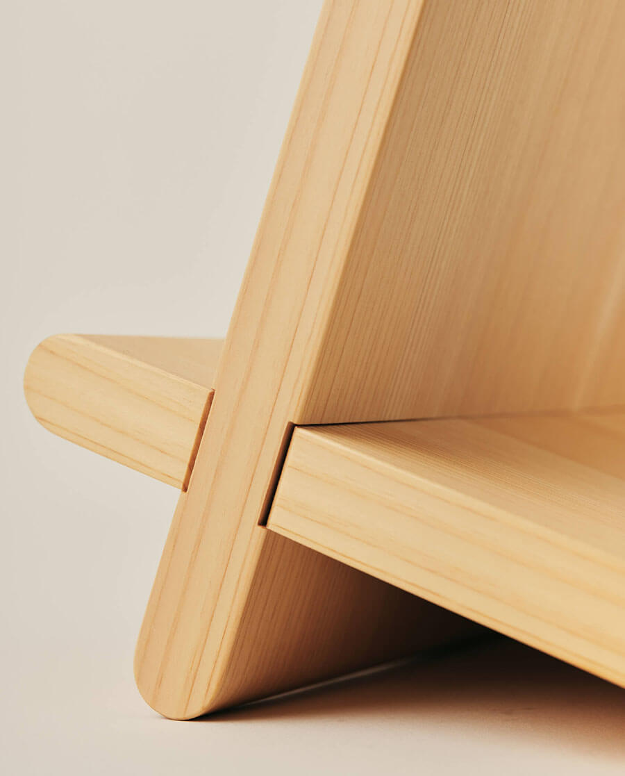 BOOKMARKER は一枚の国産ヒノキ柾目集成材から3つのパーツを無駄なく切り出しており、フラットパッキングが可能。偶然か必然か、無駄無く天板の部材を切り出したことで生じた造形は「個性」となり、同時に内側(使い手側)・外側、双方からの本へのアクセスを容易にした。