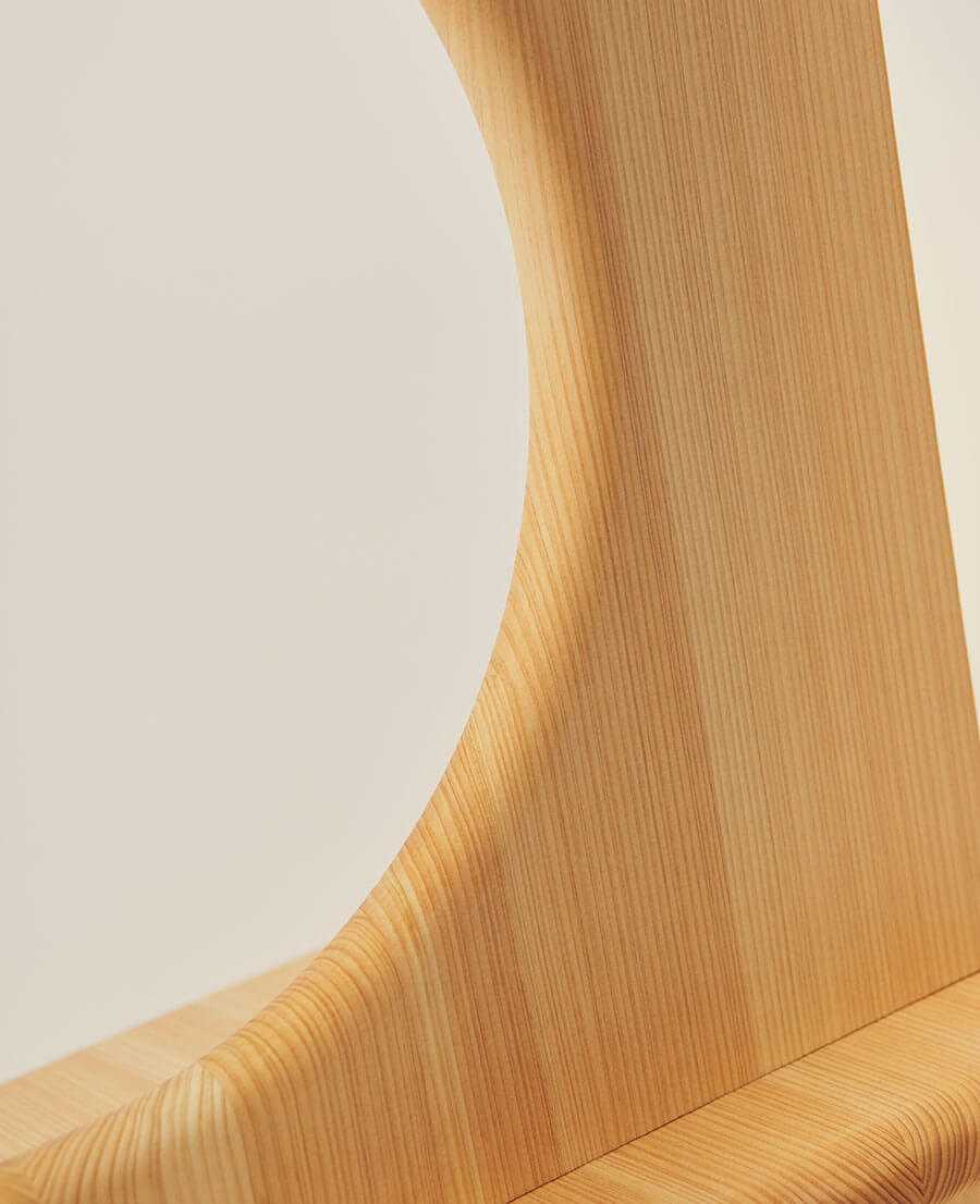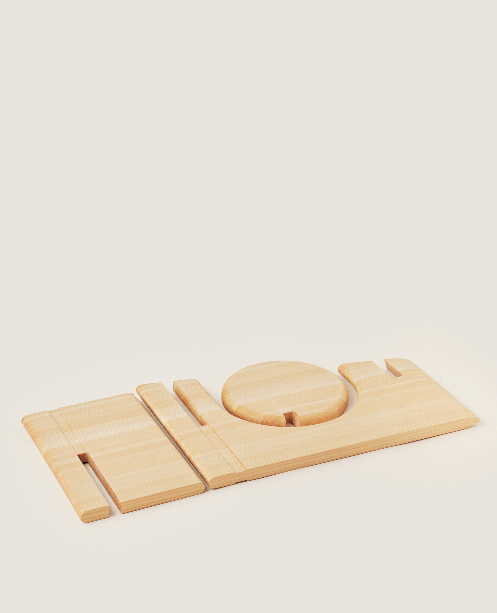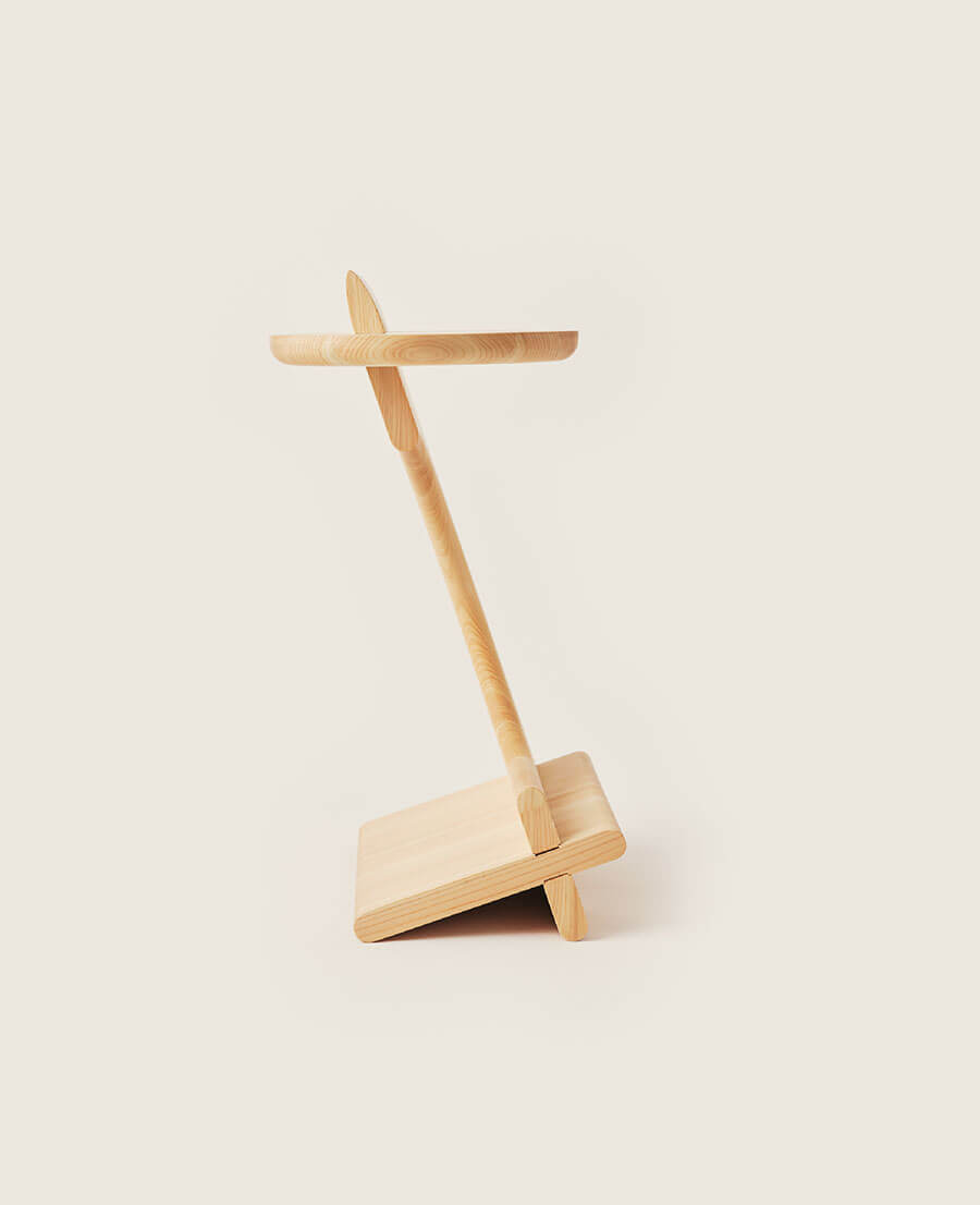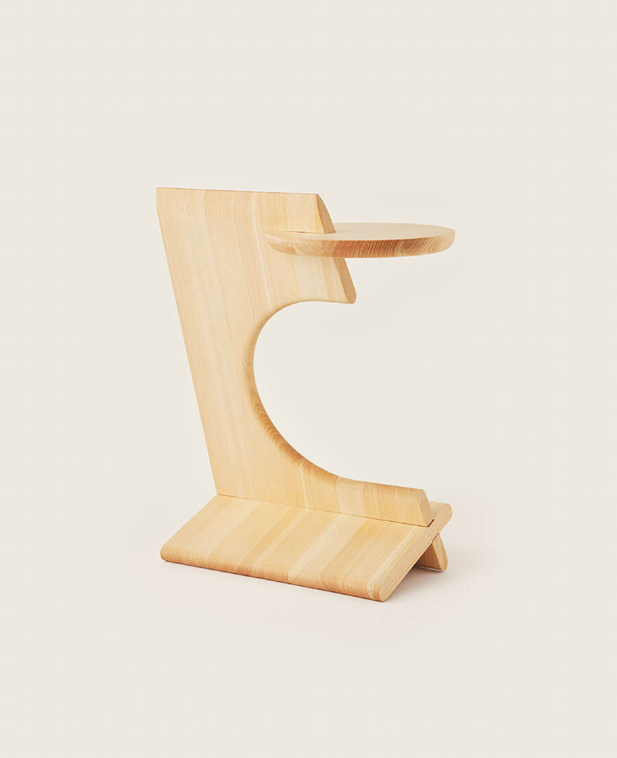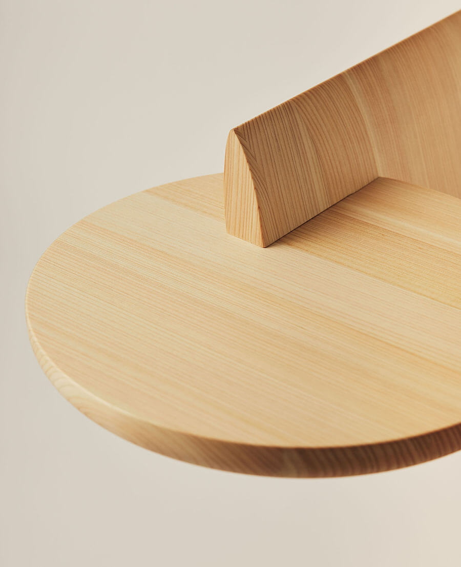 BOOKMARKER は一枚の国産ヒノキ柾目集成材から3つのパーツを無駄なく切り出しており、フラットパッキングが可能。偶然か必然か、無駄無く天板の部材を切り出したことで生じた造形は「個性」となり、同時に内側(使い手側)・外側、双方からの本へのアクセスを容易にした。
