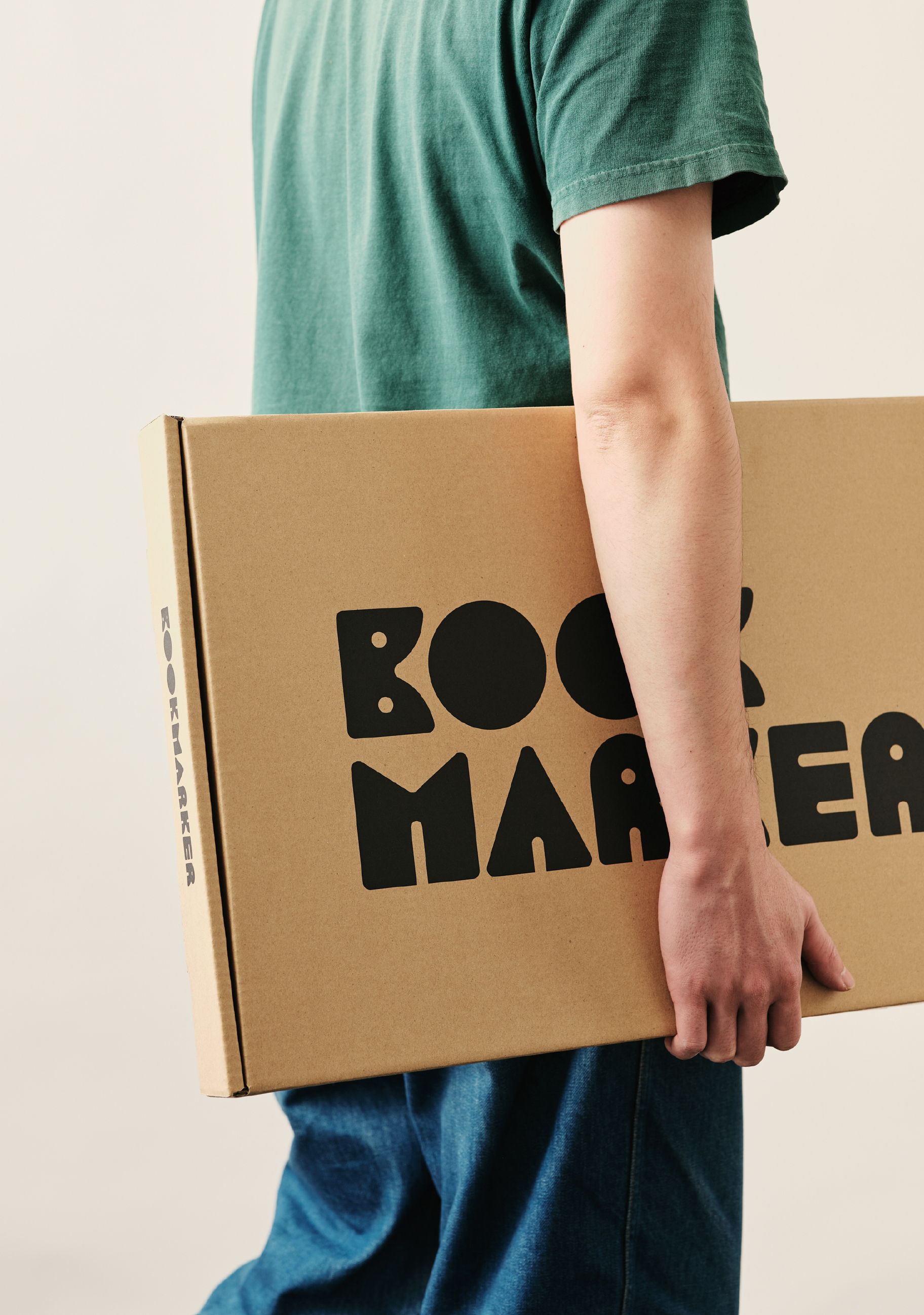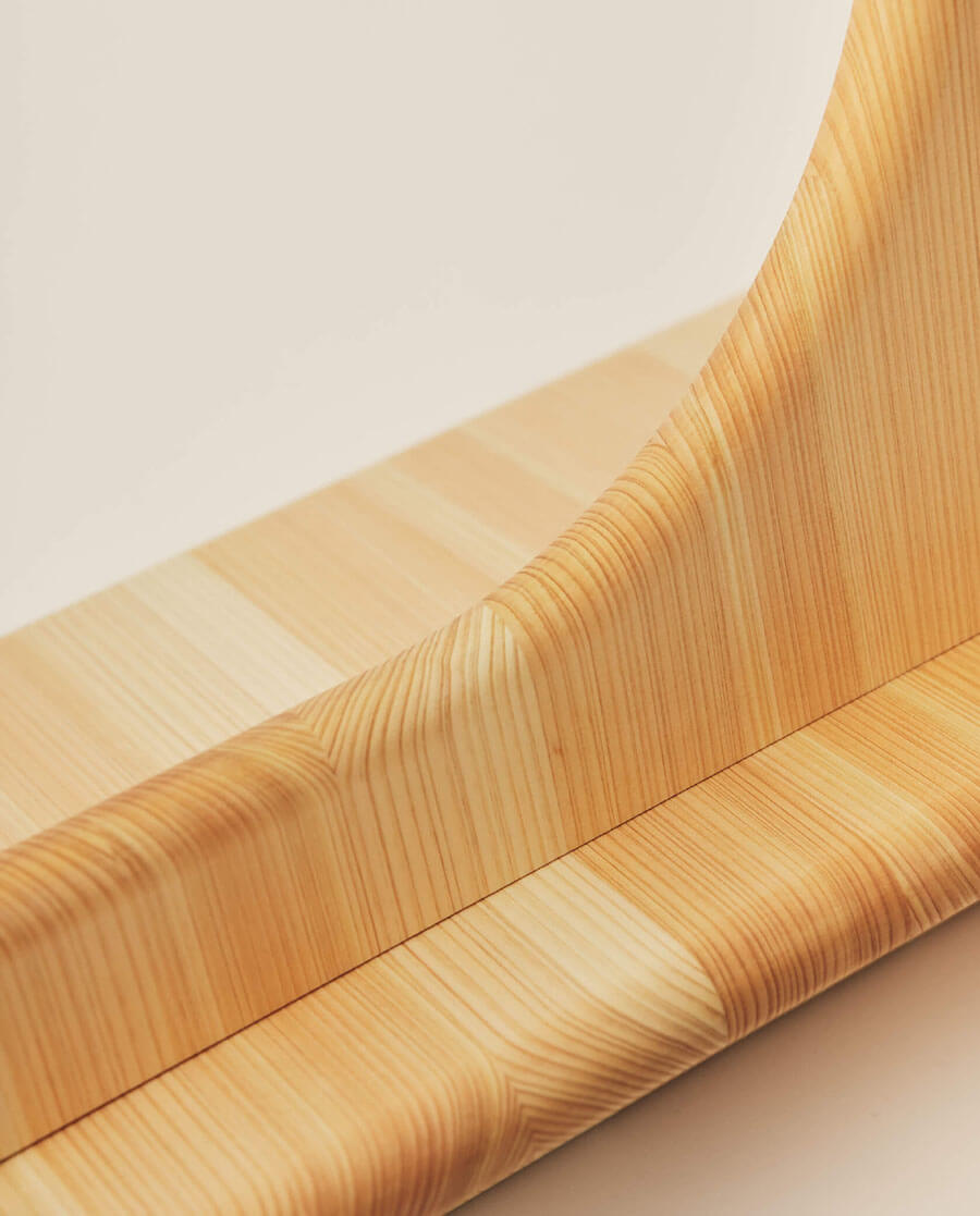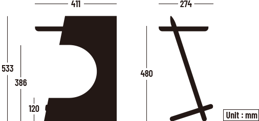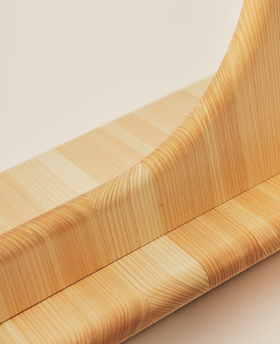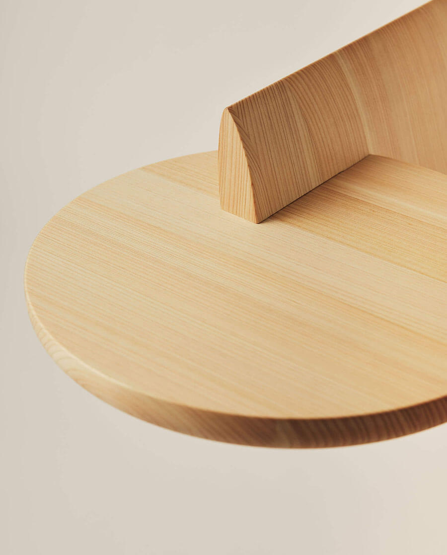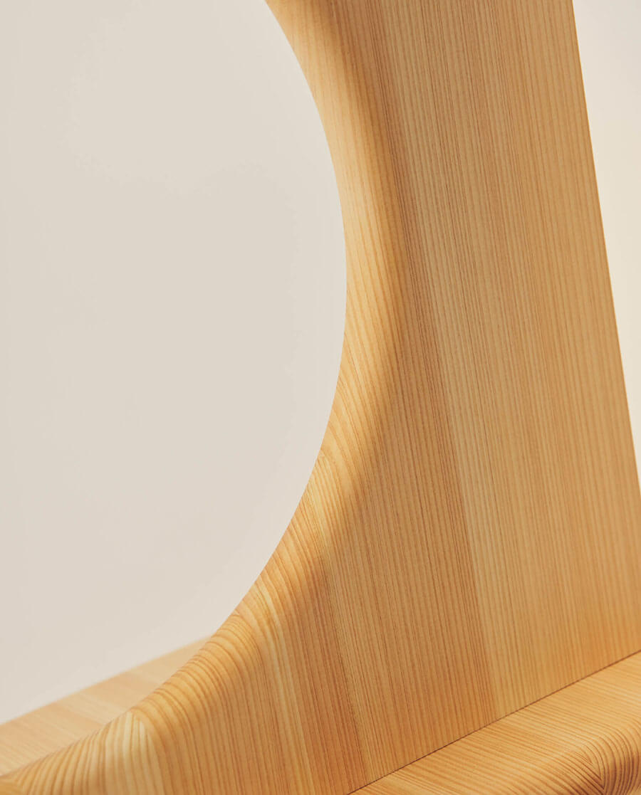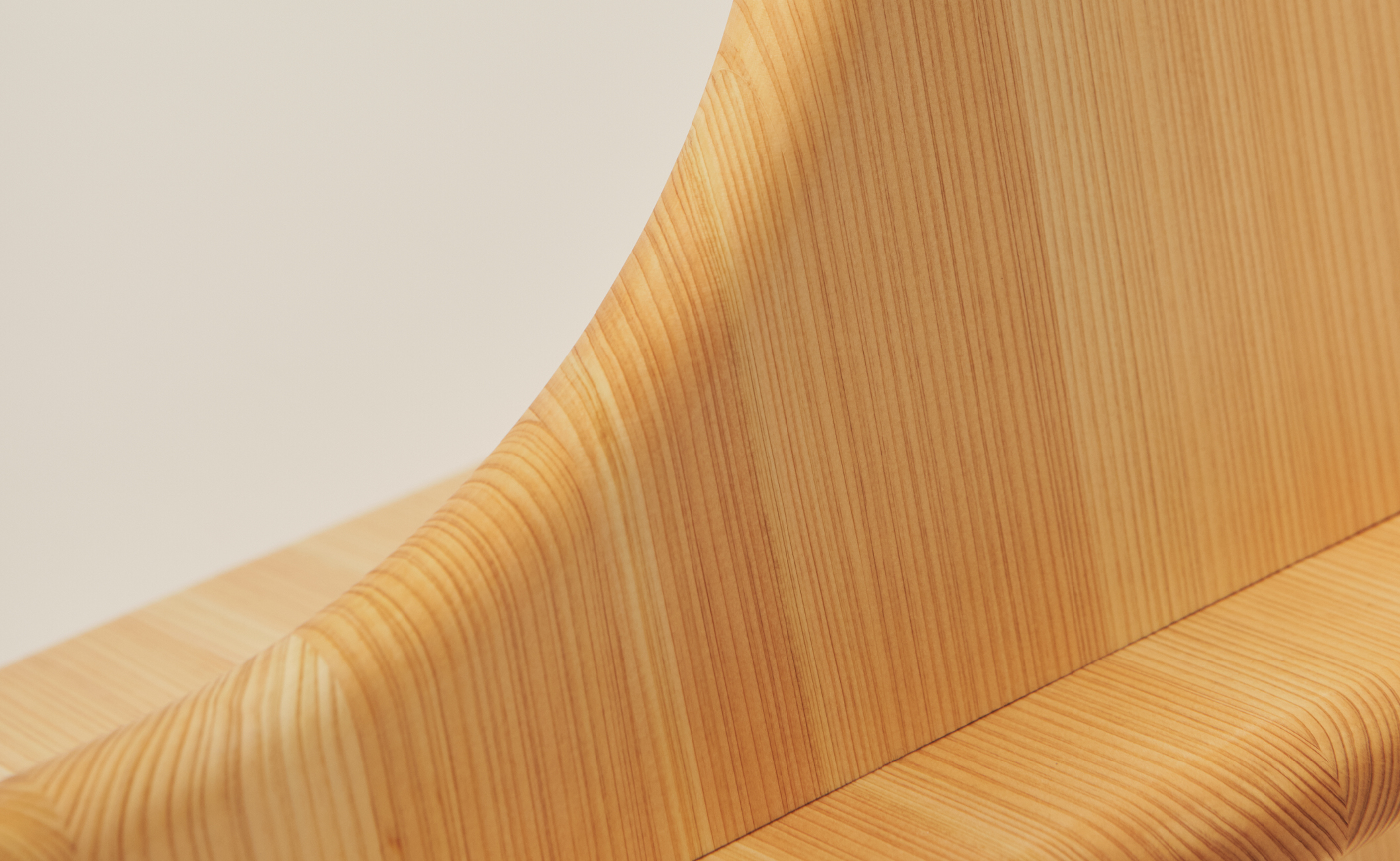 BOOKMARKER は一枚の国産ヒノキ柾目集成材から3つのパーツを無駄なく切り出しており、フラットパッキングが可能。偶然か必然か、無駄無く天板の部材を切り出したことで生じた造形は「個性」となり、同時に内側(使い手側)・外側、双方からの本へのアクセスを容易にした。