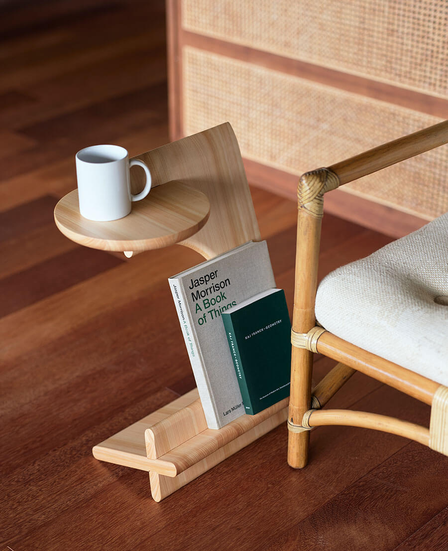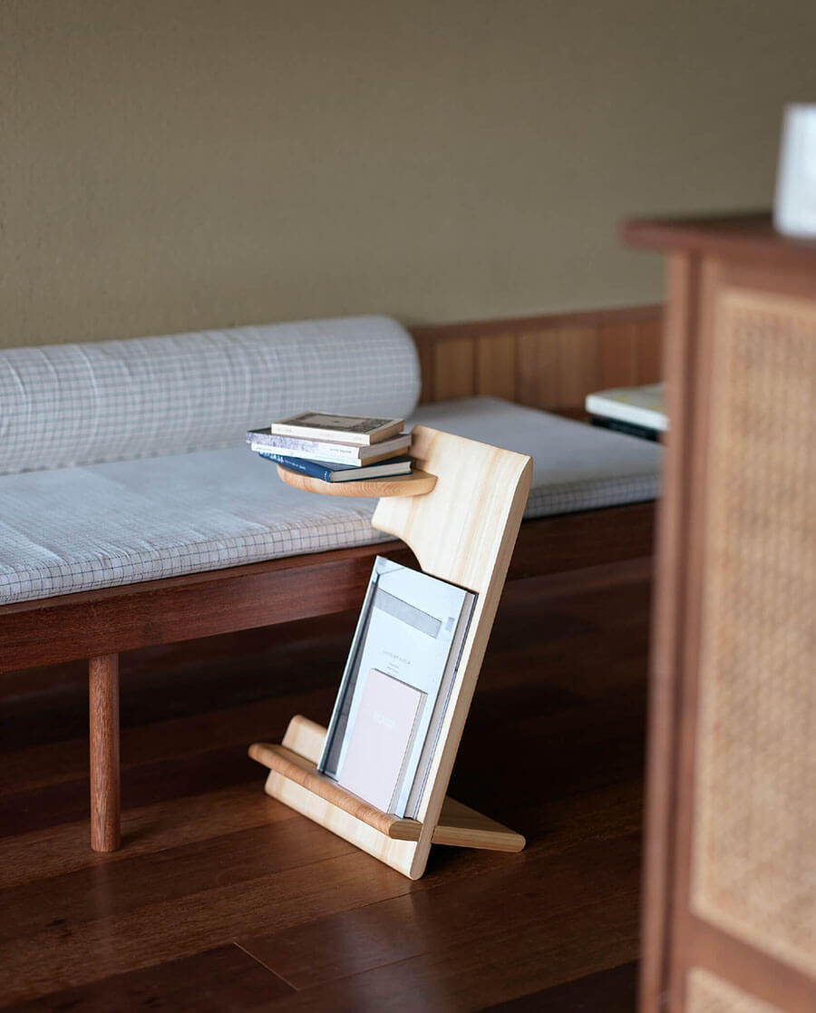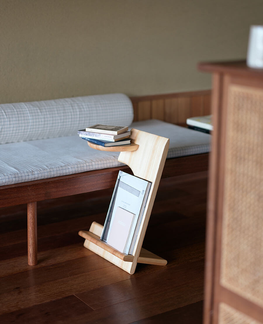 This is a “bookmark.” It may sound like an exaggeration, but this piece of furniture functions as a bookmark for those who love to read or wish to enjoy reading more. By making the act of reading visually tangible, it provides a dedicated space for a novel you are about to start, a book you want to finish, or an art book you wish to keep within reach at all times.