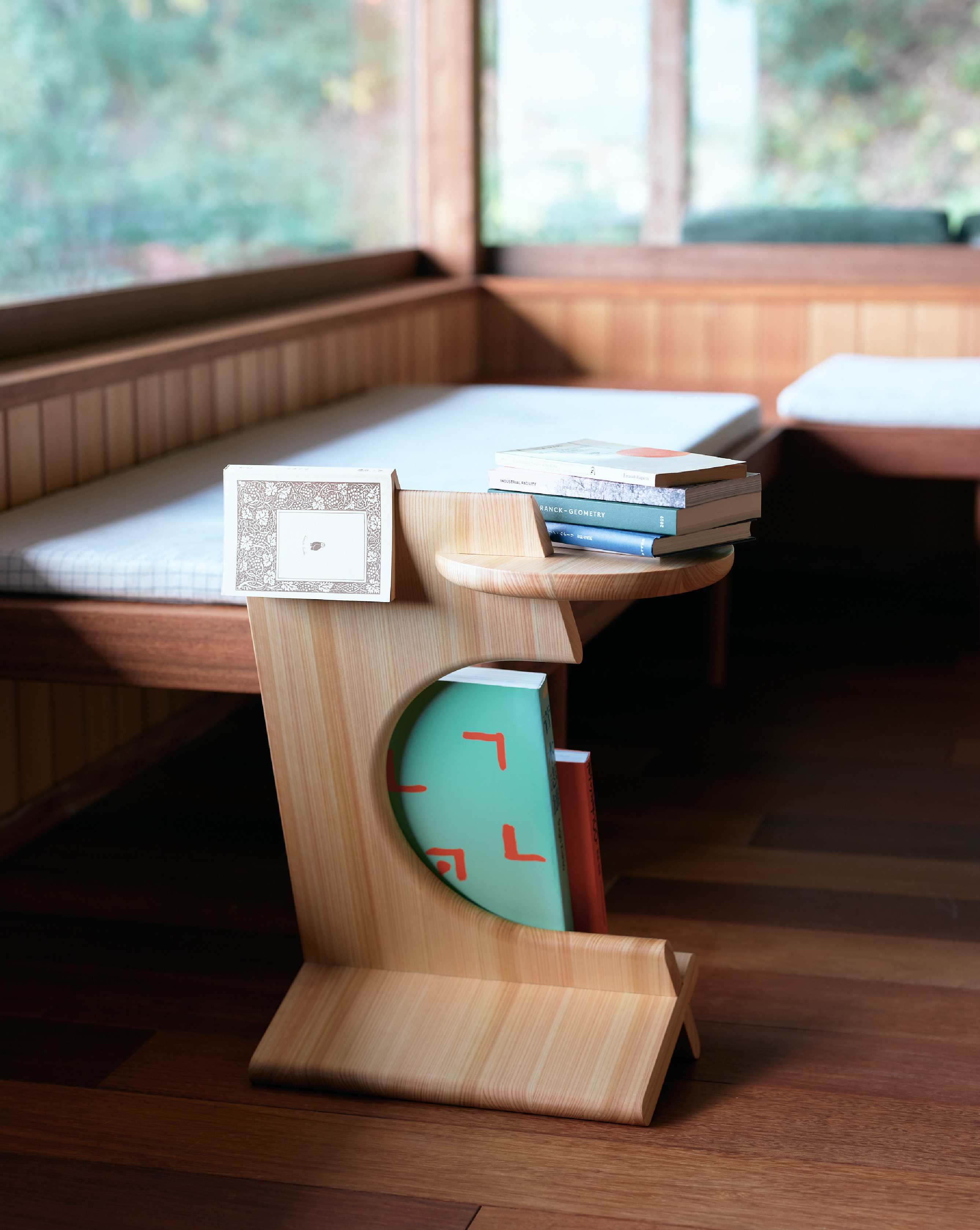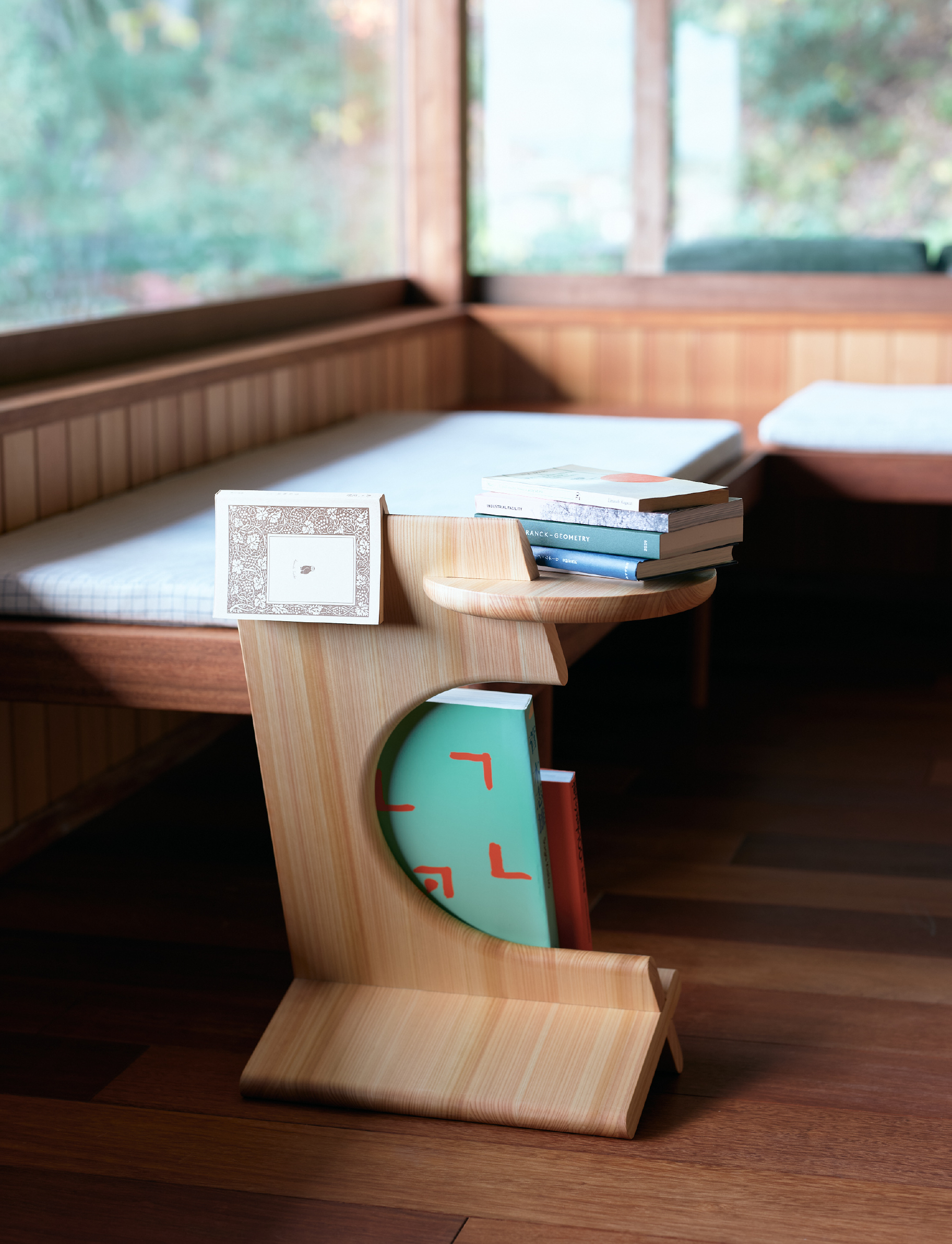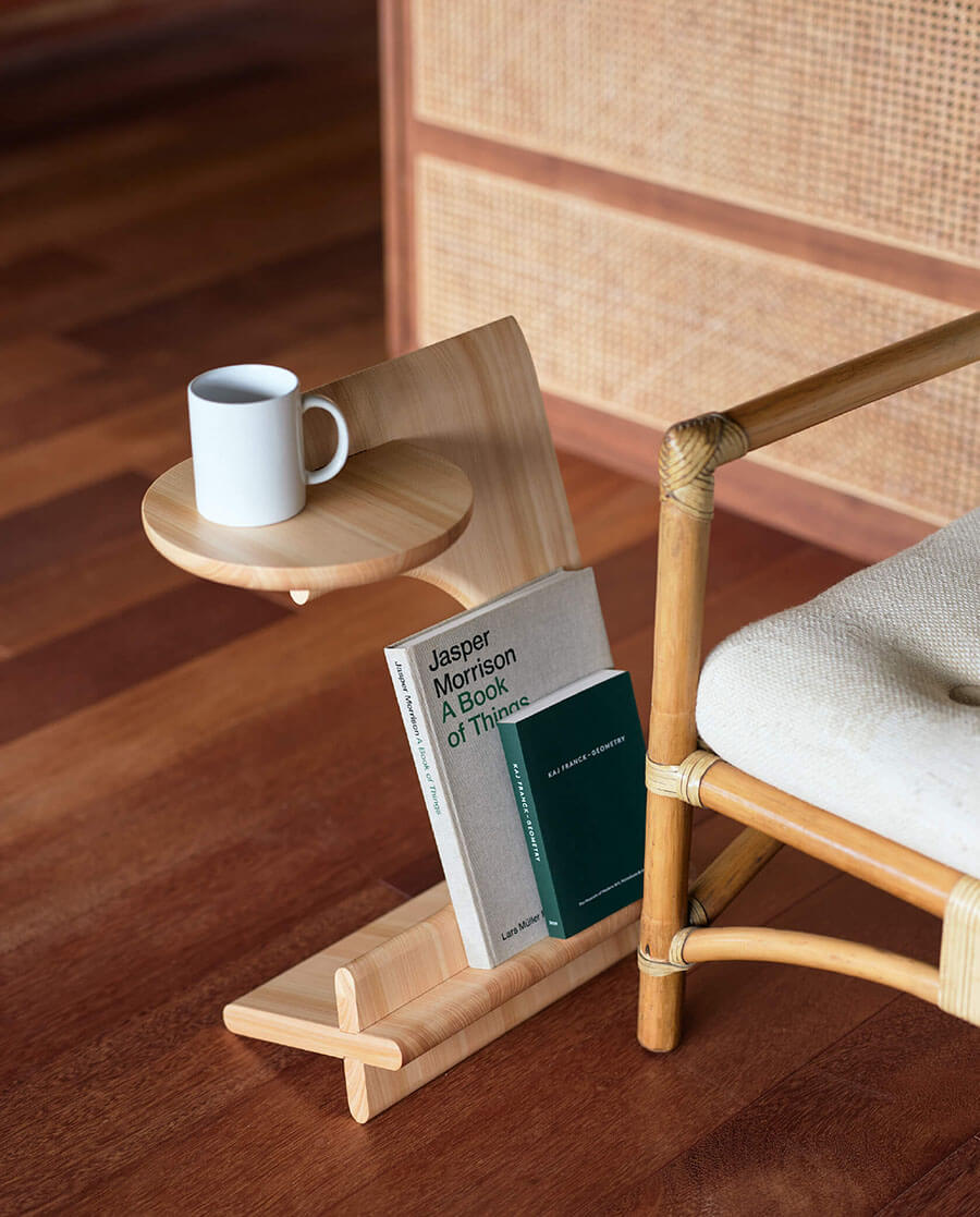 This is a “bookmark.” It may sound like an exaggeration, but this piece of furniture functions as a bookmark for those who love to read or wish to enjoy reading more. By making the act of reading visually tangible, it provides a dedicated space for a novel you are about to start, a book you want to finish, or an art book you wish to keep within reach at all times.